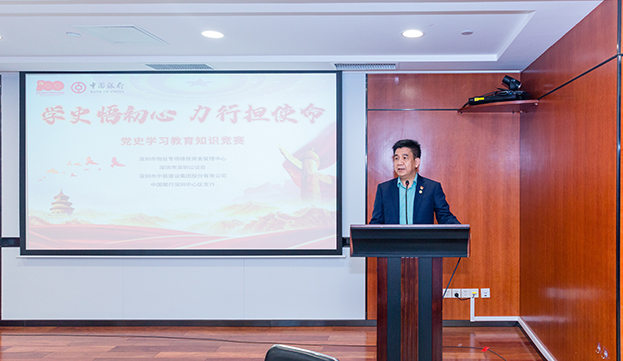 活動伊始,中裝建設(shè)副總裁黎文崇同志在致辭中強調(diào),此次黨史競賽活動,既是貫徹落實黨中央黨史學(xué)習(xí)教育決策部署的一次具體行動,也是中裝建設(shè)與中國銀行深圳中心區(qū)支行、深圳市物業(yè)專項維修資金管理中心、深圳市公證書等參賽單位構(gòu)建“黨建同心圓”的一次嘗試,有效促進了彼此的溝通交流。希望中裝建設(shè)以此次活動為契機,進一步加深與中國銀行深圳中心區(qū)支行、物業(yè)專項維修資金管理中心以及市深圳公證處的合作,共同推動黨建和事業(yè)邁上新的臺階,以優(yōu)異的成績慶祝建黨100 周年。
