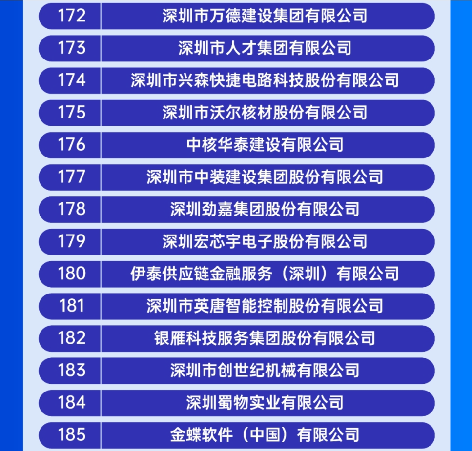 9月25日,深圳市企業(yè)聯(lián)合會、深圳市企業(yè)家協(xié)會正式發(fā)布“2023深圳企業(yè)500強(qiáng)榜單”及《2023深圳500強(qiáng)企業(yè)發(fā)展報(bào)告》,作為中國建筑裝飾企業(yè)的領(lǐng)軍企業(yè),中裝建設(shè)憑借在業(yè)務(wù)領(lǐng)域發(fā)展成果和社會貢獻(xiàn),以及品牌良好的社會聲譽(yù),蟬聯(lián)2023深圳企業(yè)500強(qiáng),位列177名。